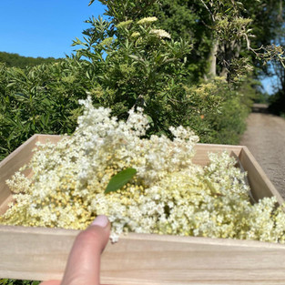 Holunderblütendolden, eine Handvoll Wildrosenblüten am besten noch geschlossene oder leicht geöffnete Knospen nehmen, diese geben zusätzlich noch eine schöne rosa Farbe.